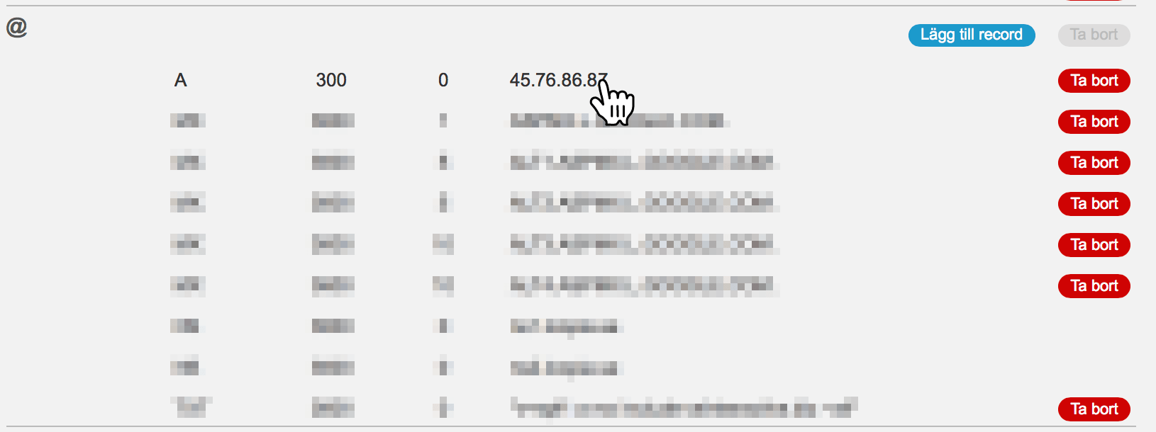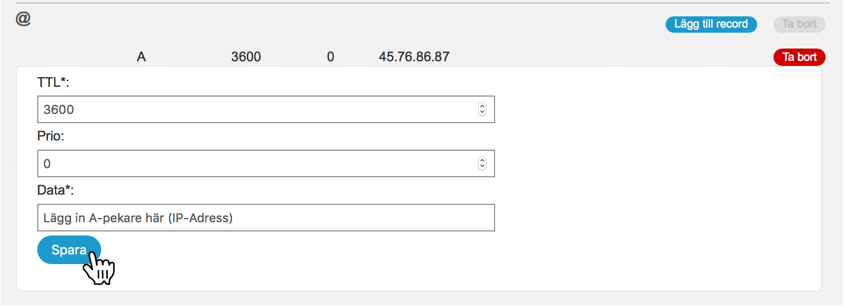 I fältet Mål lägger du in den A-Pekaren (IP-Adressen) som du vill peka domänen mot.