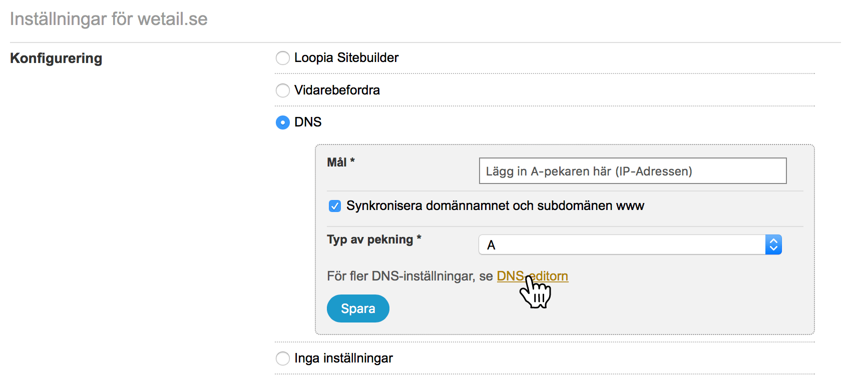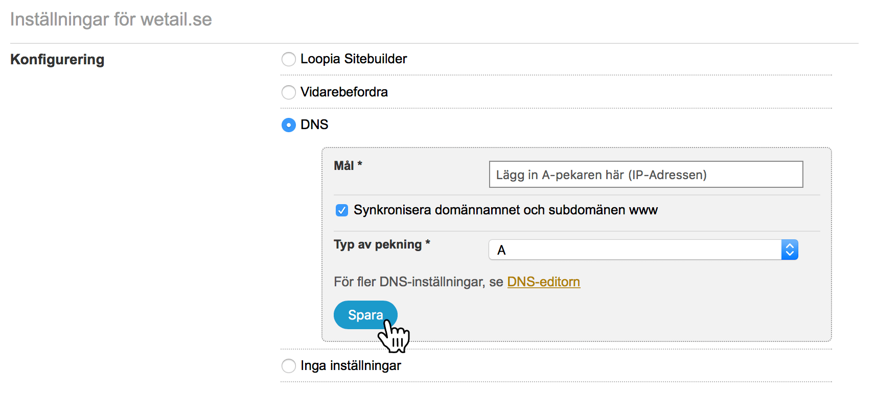 Klicka på Spara när du är klar och invänta att din domän pekas om.