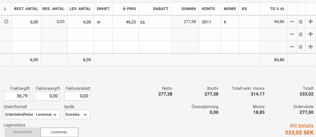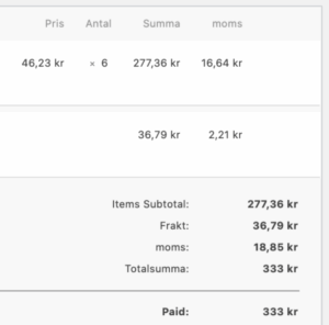 När en ordrar synkroniseras till externa program använder man alltid exklusive moms. Resultatet blir att det i de fall då det finns flera produkter i ordern som har en sådan avrundning inte kommer att generera samma slutpris. Vi ser här att Fortnox får ex moms-värdet till 277,38 kr, vilket medför att orderns totalvärde hamnar på 333,02 kr istället för 333 kr blankt som i WooCommerce.