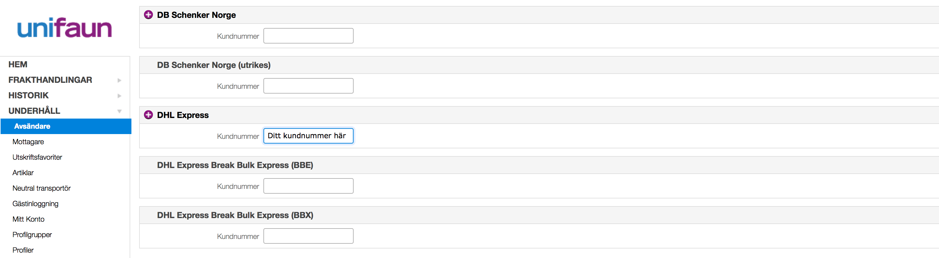 Du måste ange ditt kundnummer för vald speditör hos Unifaunonline eller Pacsoftonline.