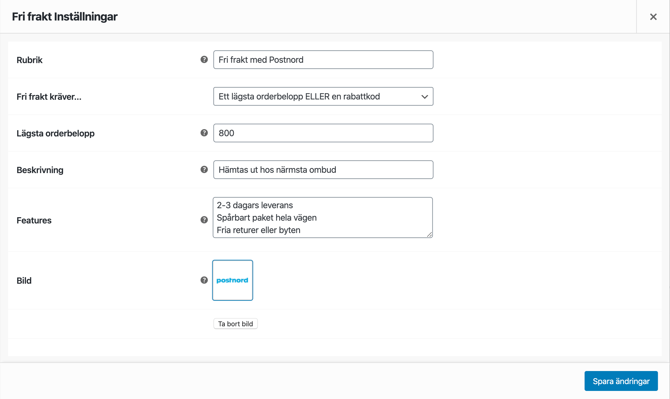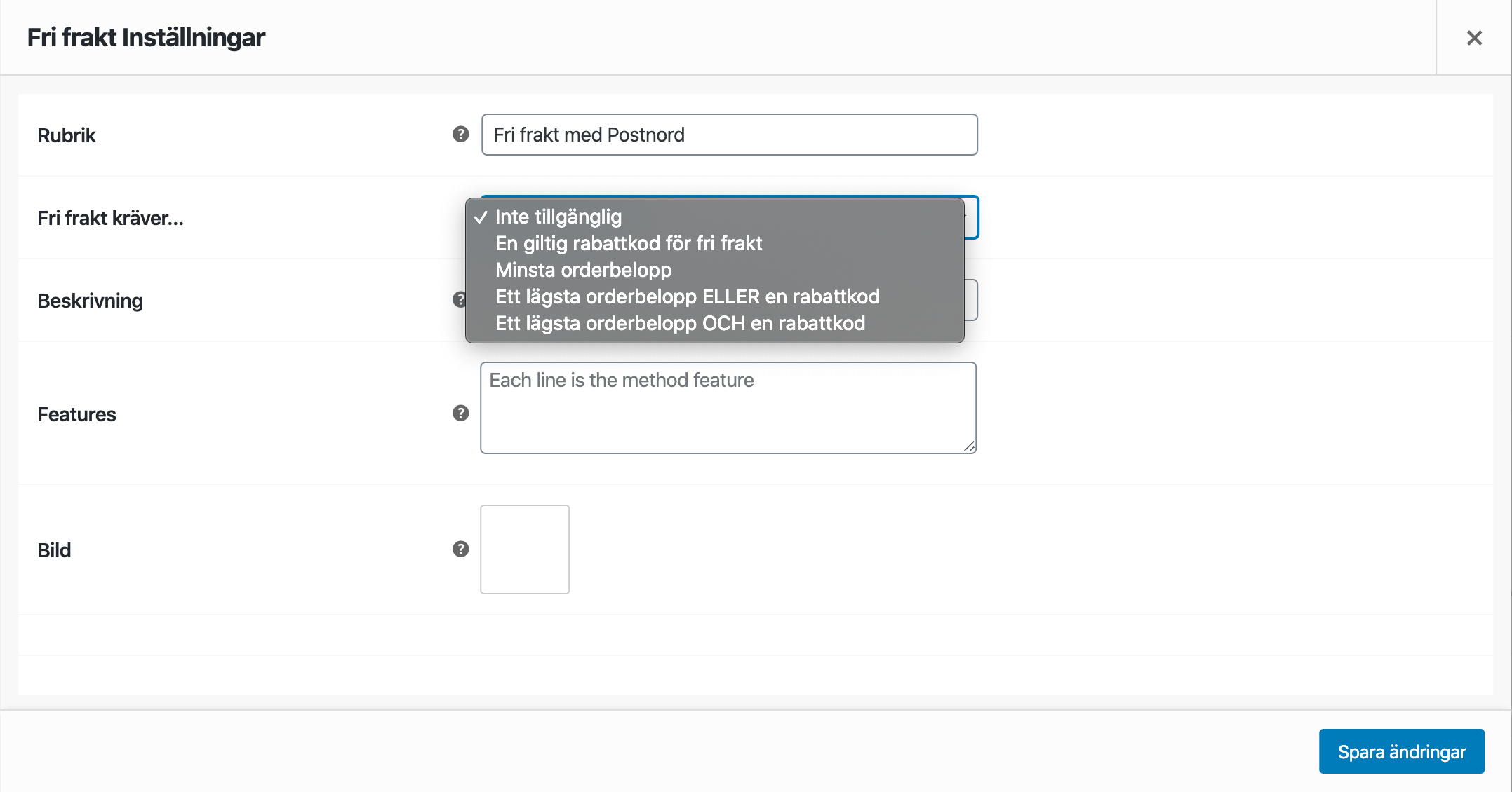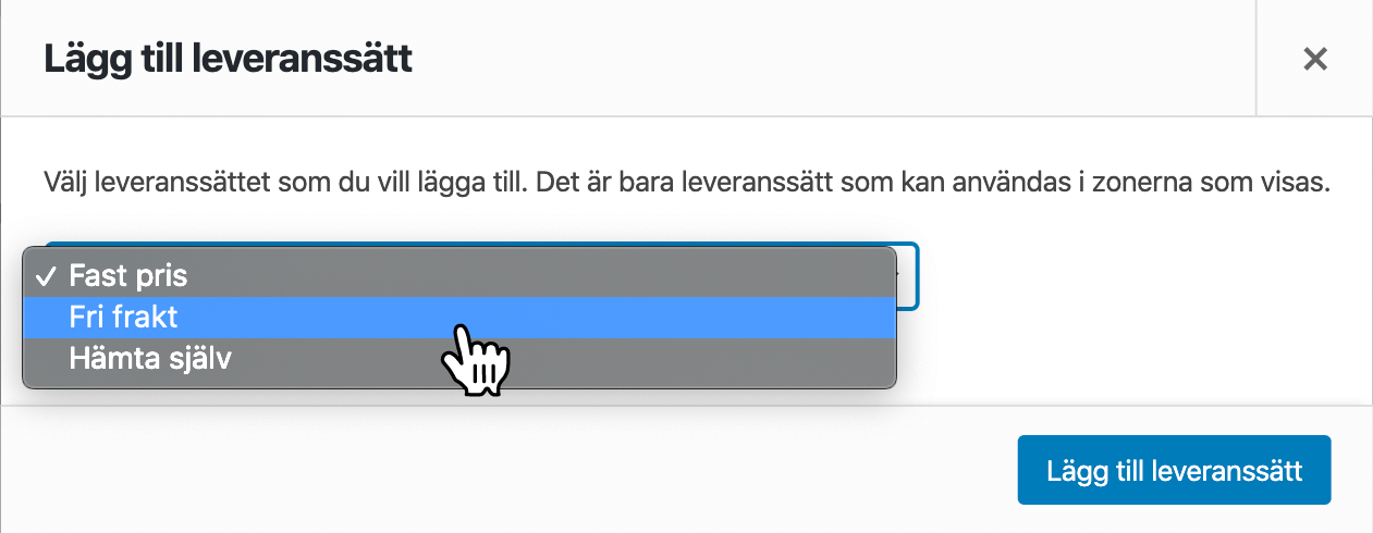 WooCommerce stödjer tre fraktsätt: Fast pris, Fri frakt och Hämta själv. Om du har flera olika fraktsätt med samma pris kopplat till sig så lägger du upp separata Fast pris-frakter för varje alternativ.