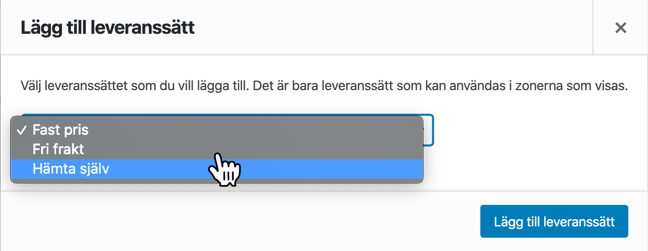 En popup kommer att öppnas där du väljer vilket leveranssätt du vill ställa in. När du valt leveranssätt klikar du på knappen Lägg till leveranssätt.