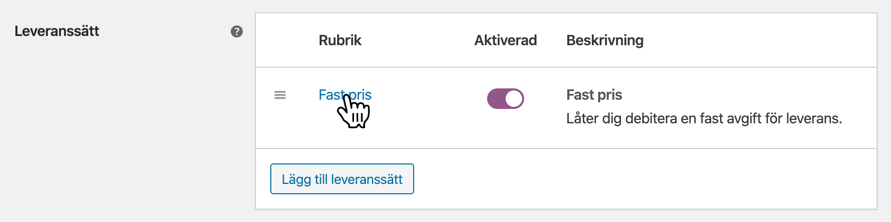 Välj Fast pris i select-menyn i popup-fönstret och klicka på Lägg till leveranssätt