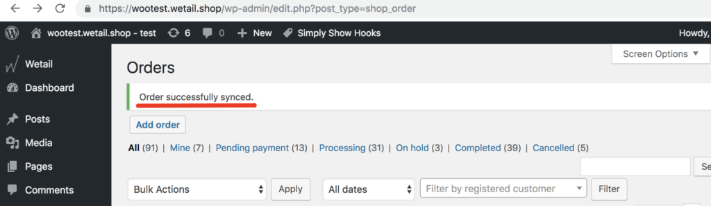 - Säkerställ att ordern synkroniseras och du får detta meddelande (se nedan)