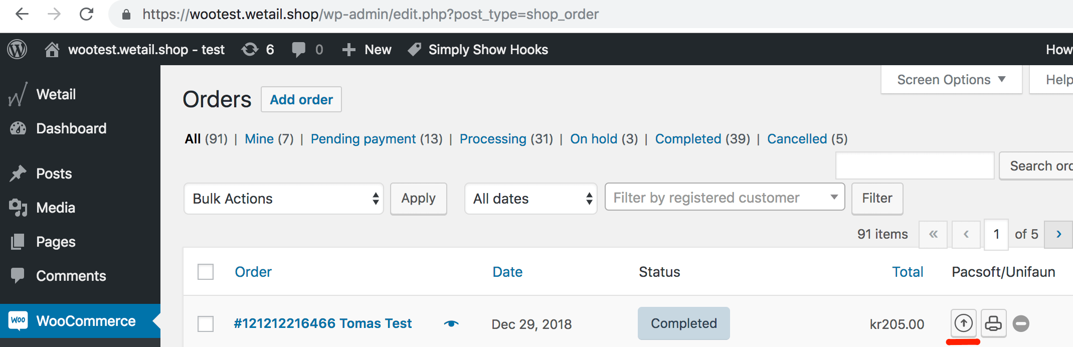 - Klicka på uppåtpilen under Pacsoft/Unifaun-kolumnen på önskad order för synkronisering