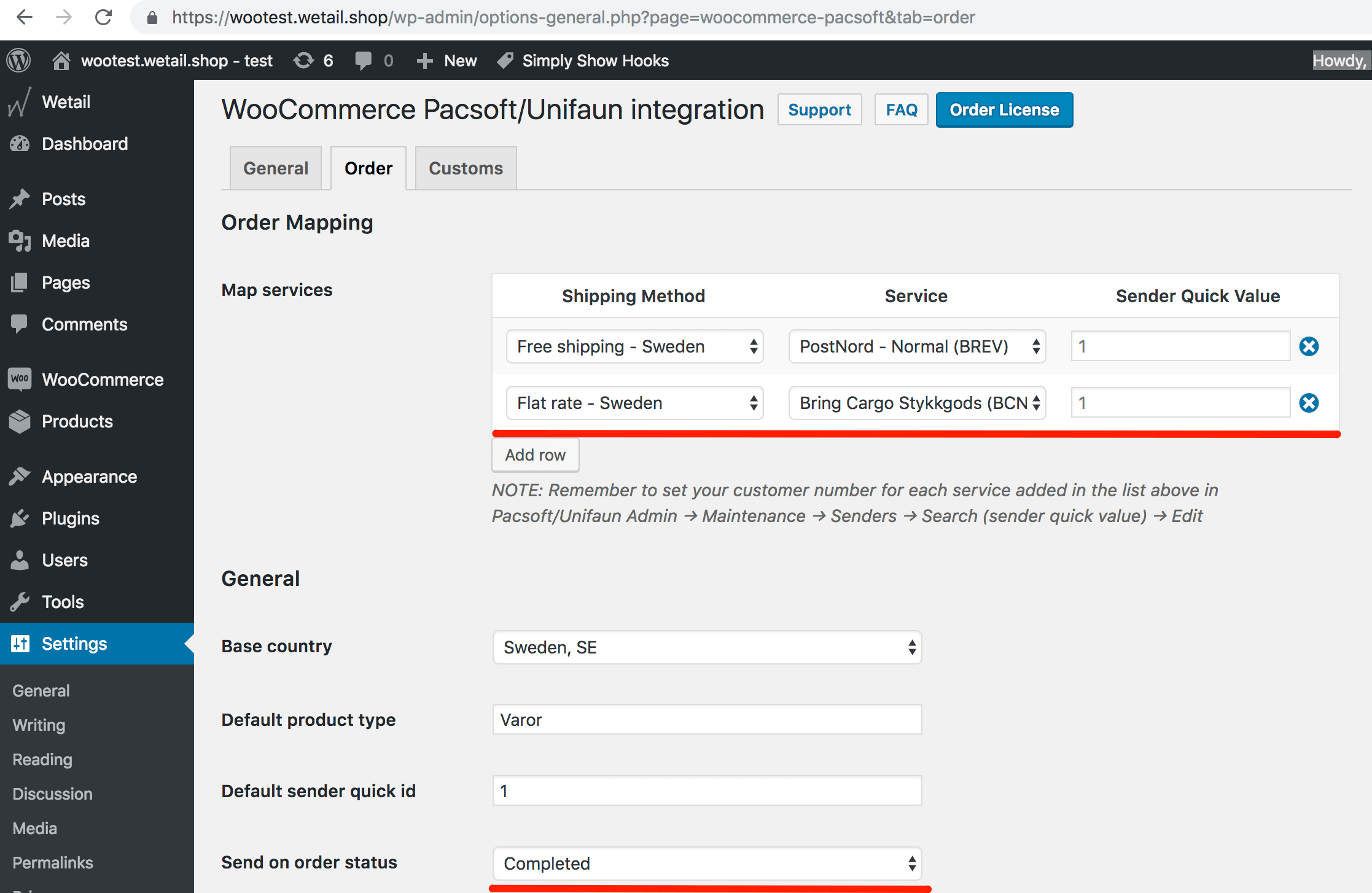 - Navigera till Inställningar->Pacsoft/Unifaun och fliken Order