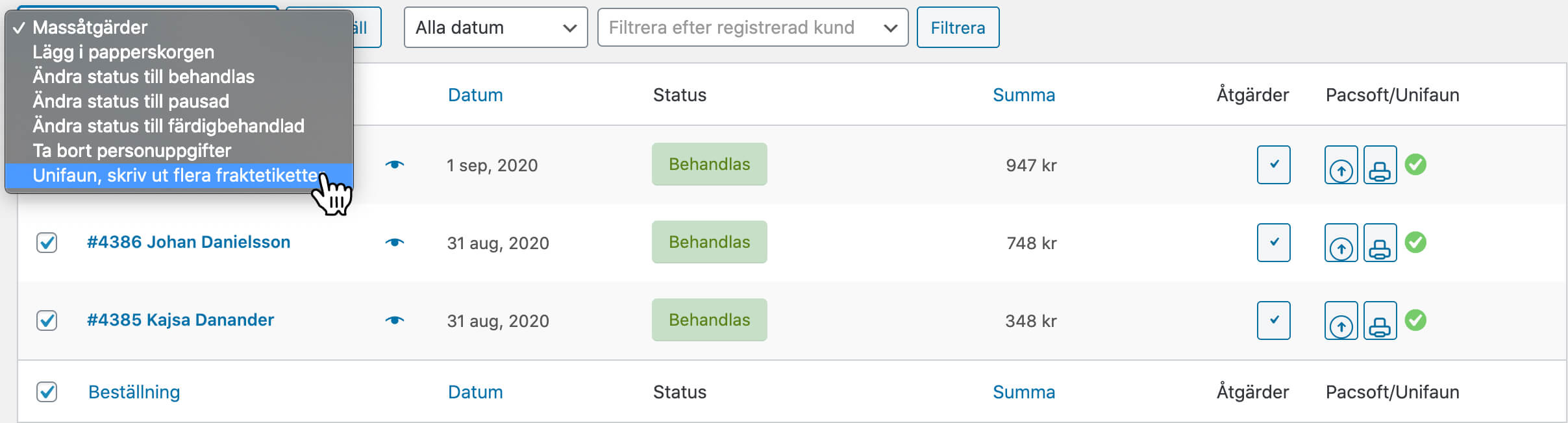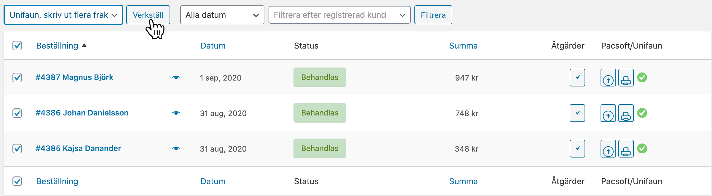När en order är markerad med en grön ikon är den synkad till Unifaun eller Pacsoft.