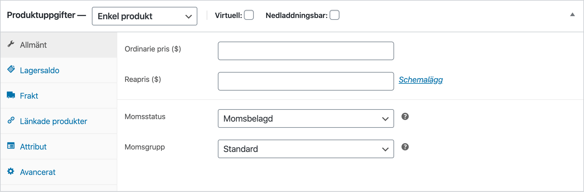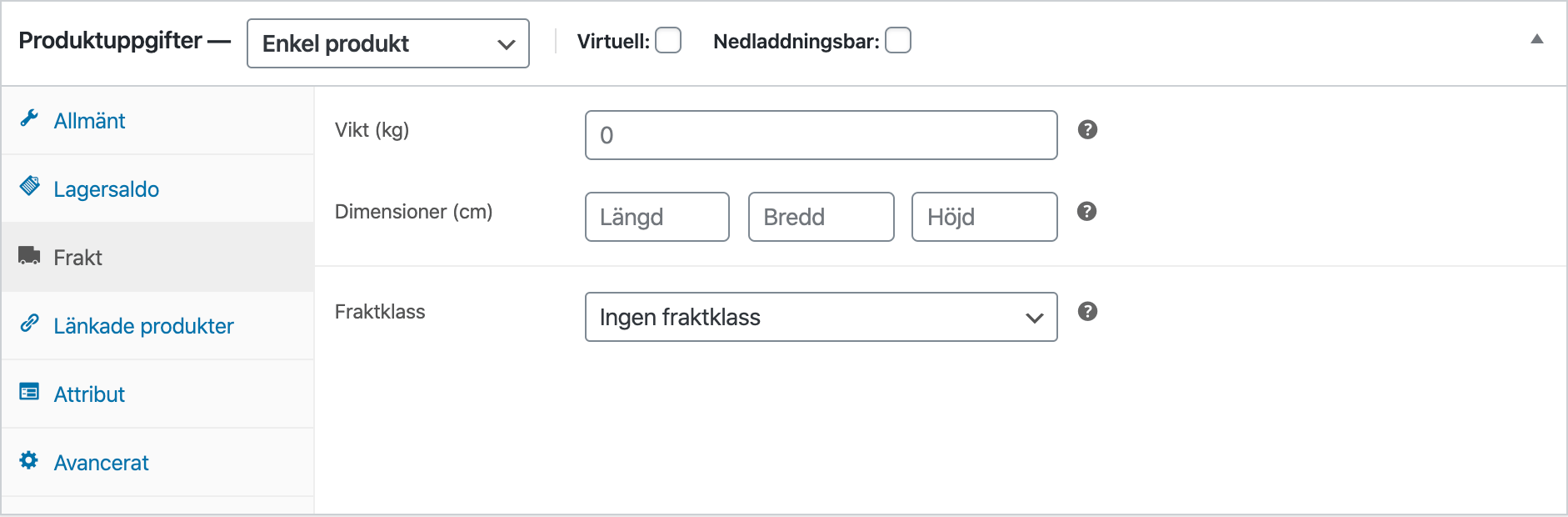 Virtuell: Innebär att det inte är en fysisk vara, det kan vara allt från en digital produkt som är nedladdningsbar eller en tjänst. Aktiverar man Virtuell produkt så behöver inte kunden välja frakt i kassan.