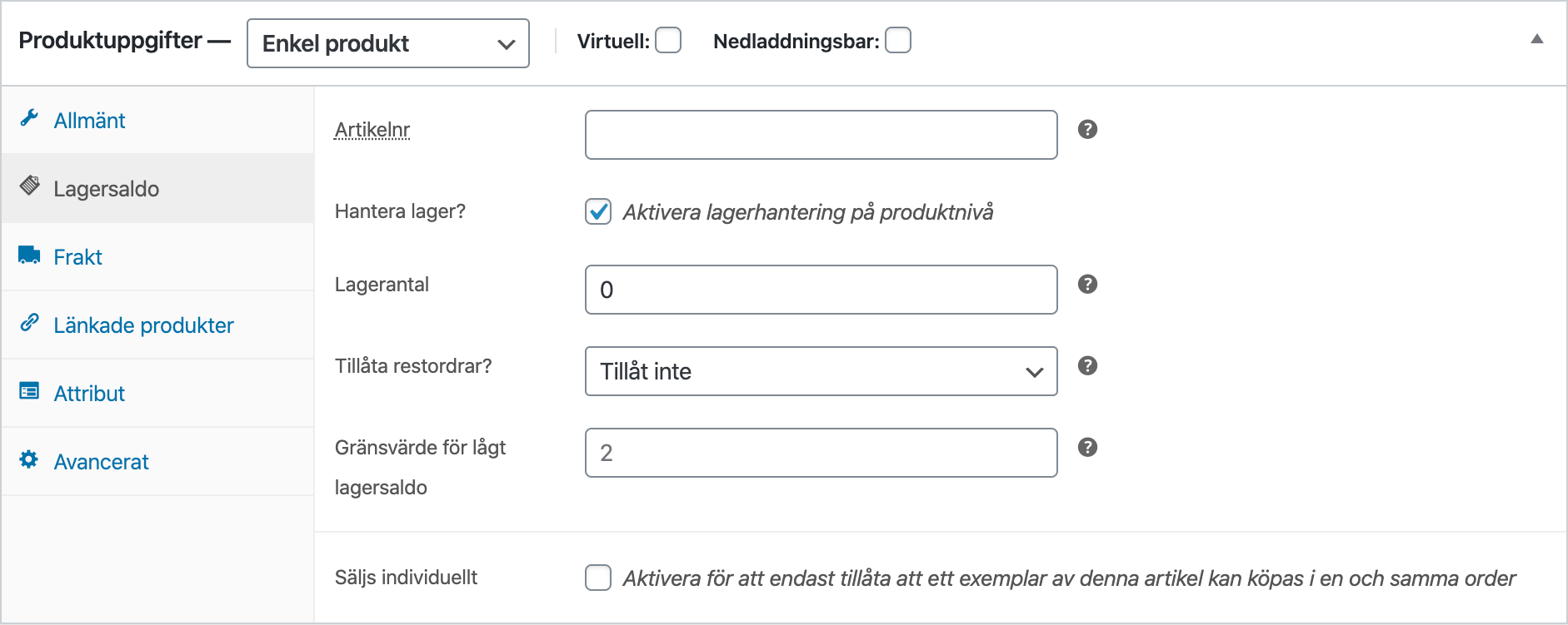 Ett tips är att inte använda mellanslag eller märkliga tecken i detta fältet. Artikelnumret används alltid som den unika identifieraren för externa system, d.v.s. att om du kopplar WooCommerce till externt affärsystem som Fortnox så tillåter inte dom andra tecken än a-z och 0-9 därför kan det vara bra att redan från början göra rätt på denna punkten.