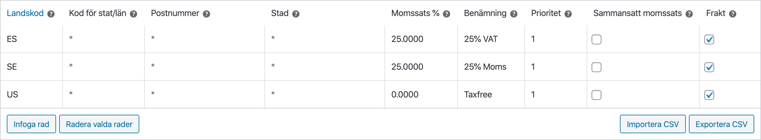 Kod för stat/län: Gäller för länder som har olika moms i olika regioner, t.ex USA som har olika moms i olika delstater. Låt * vara kvar i detta fält.