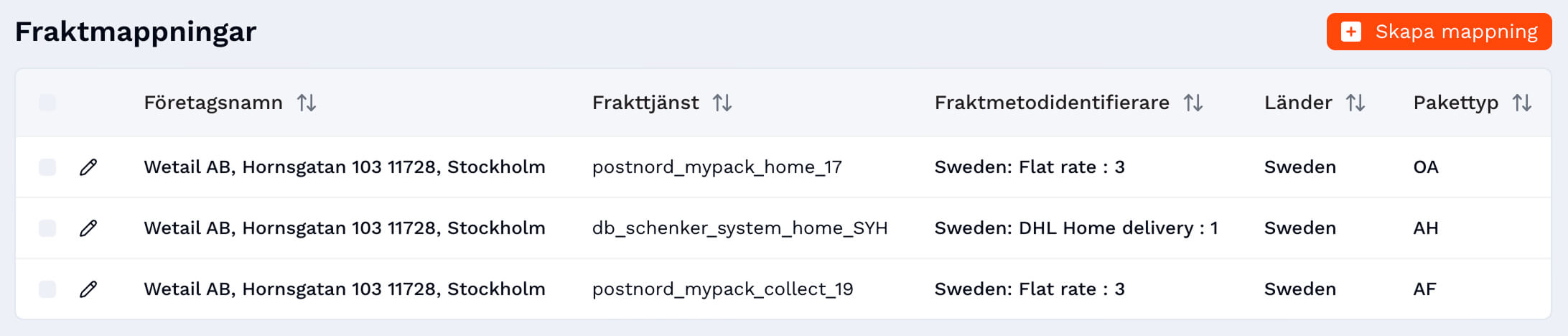 Fraktmappning i Wetail Shipping