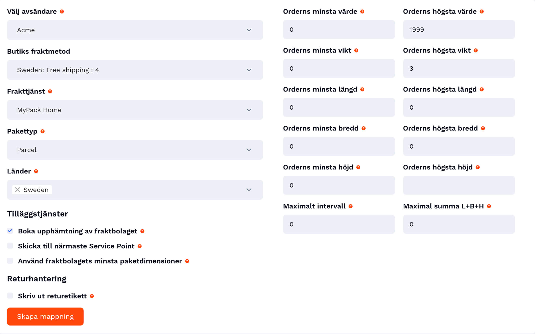 Vill man sätta eventuella regler för ordervärde, vikt och/eller dimension ställs det in till höger i respektive fraktmappning. Läs avancerade fraktmappningar.