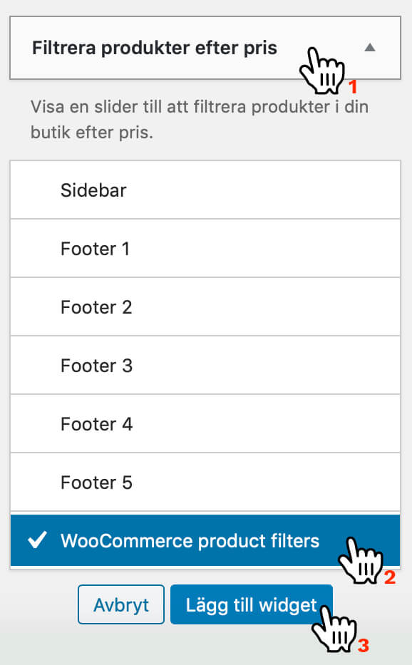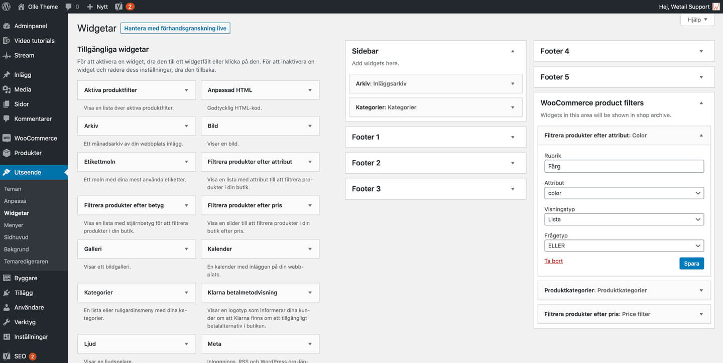 Widgets i WordPress är små moduler som man kan dra stor nytta av för att lägga till extrafunktioner i sin e-handel eller hemsida. Vanligast är att man har Widgets i ett bloggarkiv, sidfoten eller på arkivsidorna för sina produkter. Ditt tema bestämmer helt vilka ytor som på din shop som är förberedda för Widgets samt hur dessa är designade.