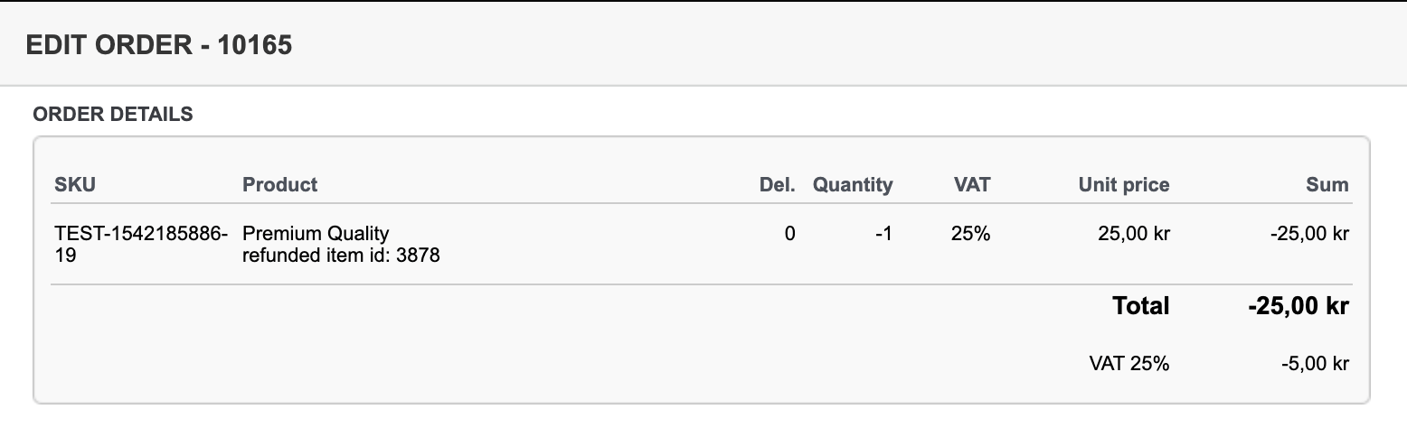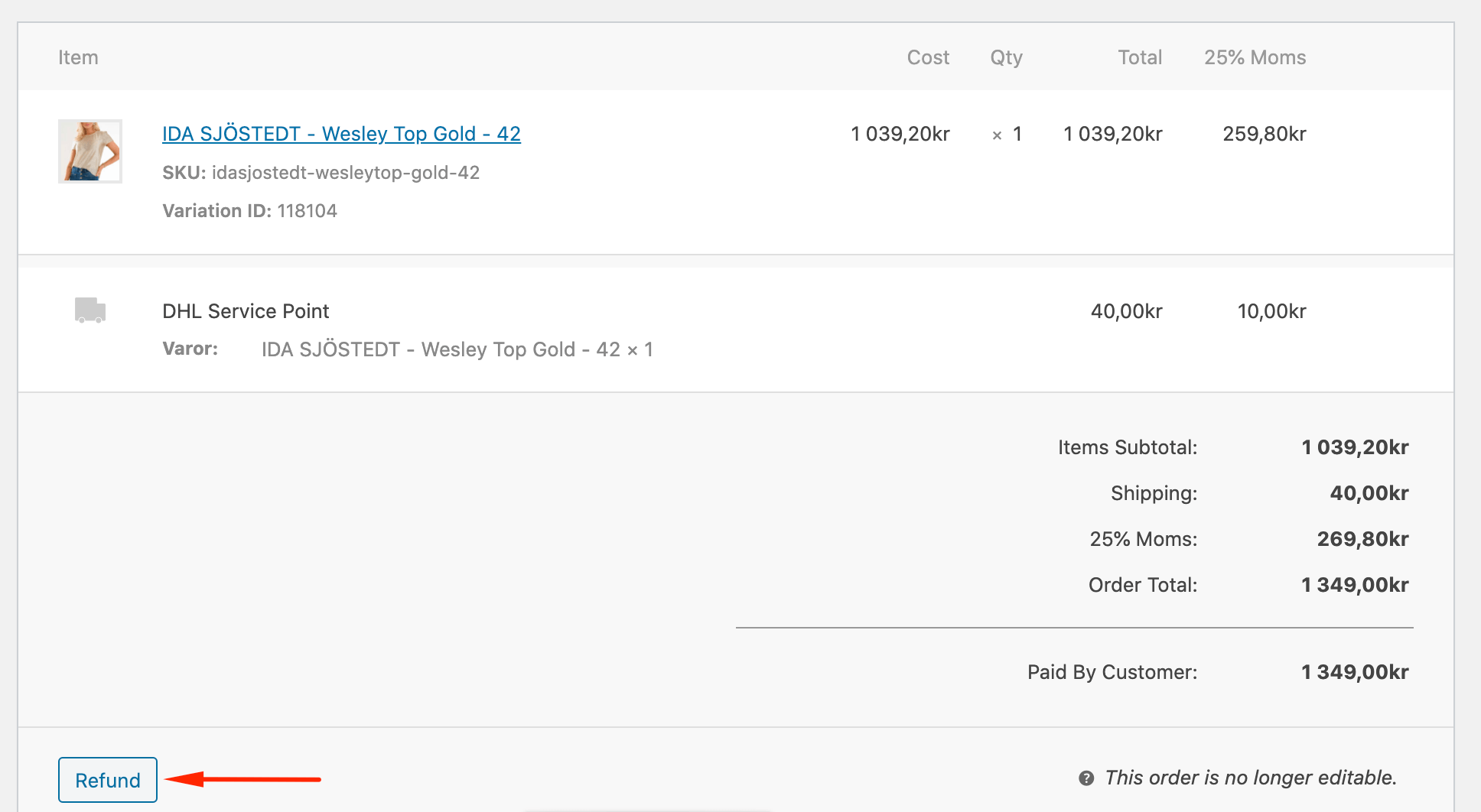 - Navigera till ordern som ska returneras. Inne i ordervyn, klicka på Refund.