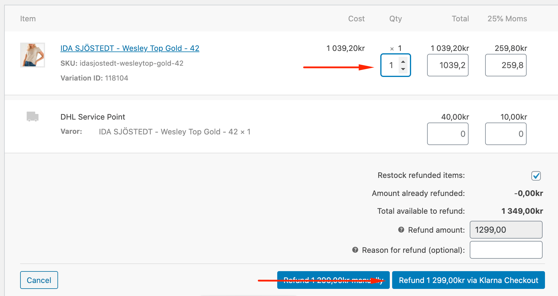 Efter det klicka på Refund <belopp> via Klarna Checkout