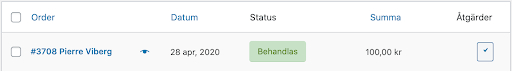 Om betalningen är godkänd från Klarna så kommer ordern få orderstatus Behandlas i WooCommerce. Orderraden kommer se ut såhär.