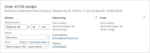 - WooCommerce: Klicka på ordernumret och gå in på ordern.